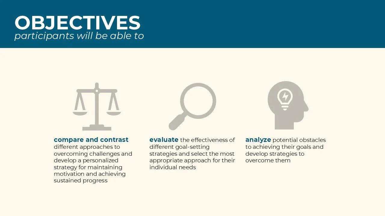 This workshop will equip attendees with the skills and mindset to effectively set and achieve their goals. We'll delve into the importance of self-reflection, identifying values and passions, and breaking down large goals into smaller, manageable steps. Learners will learn to overcome procrastination, stay motivated, and celebrate their accomplishments along the way.