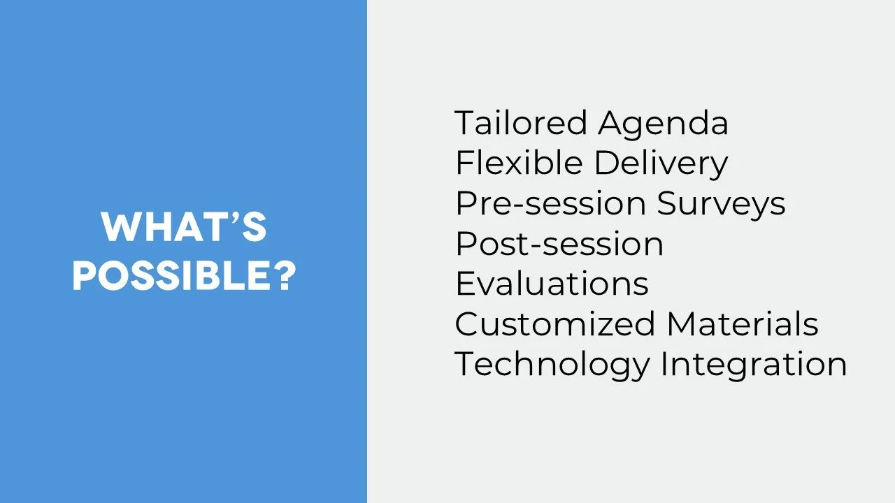 All sessions can be delivered virtually or in-person, customized to fit any audience size, and tailored to your desired duration.